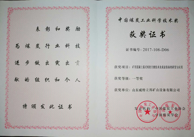• 濟寧市首屆創新大賽“煤礦采掘面濕噴除塵系統設備”創新組二等獎